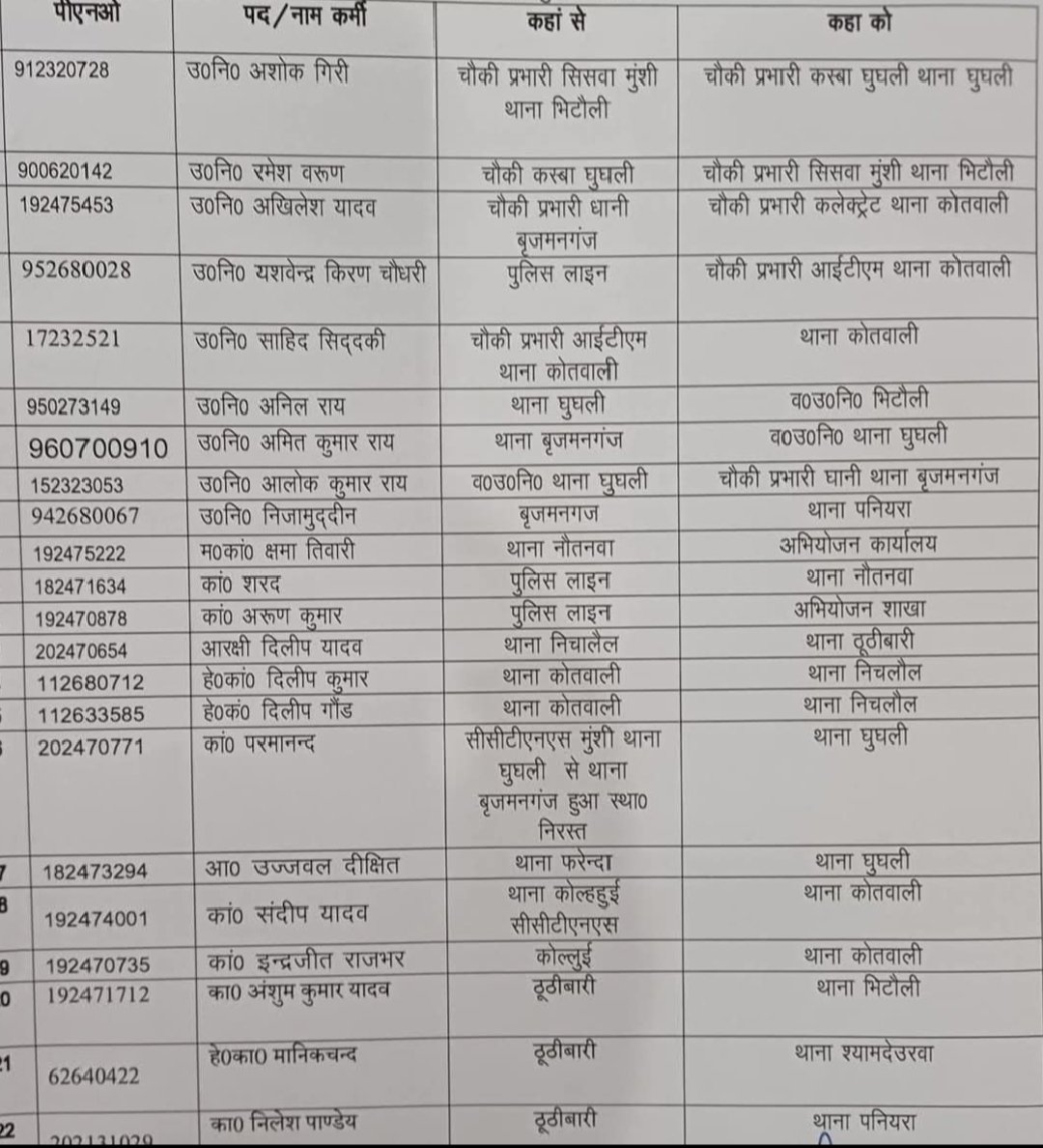 महराजगंज। जिले में कानून-व्यवस्था को दुरुस्त करने और प्रशासनिक व्यवस्था को बेहतर बनाने के उद्देश्य से पुलिस विभाग में फेरबदल किया गया है। बुधवार को जारी स्थानांतरण आदेश के अनुसार कई उपनिरीक्षकों (उनि) और सिपाहियों को एक स्थान से दूसरे स्थान पर भेजा गया है।